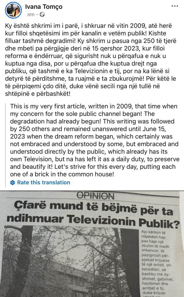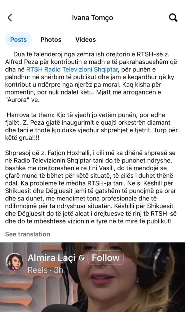 Të dashur miq, si përkthyese dhe gazetare që prej 35 vjetësh në RTSH, si një njeri me kontribute të mëdha në media (dhe kontribute nuk kam parasysh punën që kam berë për të marrë pagën, por kontributet e mëdha që m’i njeh i gjithë publiku që ka 35 vjet që e sheh emrin tim në RTSH dhe në gazetë, ku kam më shumë se 250 editoriale -kontribut të vërtetë, pasi nuk kam kërkuar të paguhem) etj. etj. dhe së fundi, që prej dy vjetësh si sekretare e Këshillit për Shikuesit dhe Dëgjuesit dhe pa mundur të jap kontributin tim ashtu siç dua pas një lufte dy vjeçare me njerëzit e papërgjegjshëm që ishin në Këshillin Drejtues të RTSH-së të cilët na bënë të jetojmë një periudhë të zezë në historinë e RTSH-së për nga shkeljet flagrante, mungesës së kontributit (mblidheshin shumë rrallë dhe nuk punonin, nuk njihnin ligjet etj), ndihem shumë e prekur të dëgjoj këto gënjeshtra nga kjo grua që nuk e di pse ndodhet ende në RTSH pas shkeljeve të rënda që ka berë në këta muaj me rekrutimet, kthimet e njerëzve të cilët ishin larguar për shkelje nga RTSH-ja etj. me të cilat sigurisht që do të merret drejtësia. Paska guxuar të na tregojë punët që ka bërë kjo në RTSH????? Kur? Çfarë profesioni ka kjo? Ku e njeh kjo median? Si arriti të futet në kandidim për zv.drejtoreshë e RTSH-së, kur ai ishte vend që më takonte mua ose ndonjë tjetri me kontributet e mia…Ndryshimet që kishim pritur që prej të paktën 15 vjetësh dhe që i kisha ëndërruar gjatë, pas shkatërrimit që i kishte bërë RTSH-së politika, janë bërë në periudhën qershor 2023-shtator 2024, kur Drejtor i Përgjithshëm ishte z. Alfred Peza. Ndryshimet që u bënë në 1 vit e gjysëm në këtë periudhë që jam e lumtur që e përjetova, nuk ishin bërë asnjëherë dhe nuk do të bëhen nëse do të ketë përsëri “Aurora” dhe “Ina Zhupa” të tjera. Rijetësimi i sallës së Orkestrës është bërë në prill 2024, në inaugurim ka qenë Presidenti i Republikës dhe gjithçka është bërë sipas vizionit të Alfred Pezës dhe me kontributin real të tij, me punë të palodhur me orë të stërzgjatura dhe ka plot punë të bukura të prekshme që ka lënë në RTSH. Televizioni në atë periudhë mori një hov të paparë, u futën podkastet, u rinovuan studiot e radios, u rikonstruktua studioja kryesore, në të cilën tashmë mund të bëheshin 12 emisione, u rinovua News Room-i, u bë RTSH 24 një kanal i veçantë me infrastrukturë më vete, u futën rreth 40 emisione të reja gjithëpërfshirëse ku për herë të parë u përfshinë shtresa të popullsisë që nuk ishin përfshirë ndonjëherë, si psh. romët, u punësua Ina Majko, e cila sot është deputete, dhe për këtë duhet falënderuar z. Alfred Peza dhe Bojken Lako. Kontributet janë aq të mëdha, saqë nuk arrij t’i përmbledh dot të gjitha në një status. Cili ishte roli i kësaj gruas këtu në podkast? Cilët elementë ka bërë kjo? A i përmbush kjo kriteret për të punuar në RTSH? A e dini ju si emisionet në kohën e kësaj bëheshin si muhabet rruge? As skenar as gjë. Merr njerëz nga rruga dhe krijo podkaste. Për cfarë duhen 85 podkaste? Të gjitha këto meritojnë hetim. Ndërkohë, nuk e di çfarë bën kjo ende në RTSH dhe i jepet ekrani për të gënjyer??? Si sekretare e Këshillit për Shikuesit dhe dëgjuesit do ta ndjek këtë problem si dhe probleme të tjera të krijuara në këto kohë, si heqja e programeve të rëndësishme dhe zëvendësimi i tyre me paçavure dhe njerëz që nuk dinë shqip, shkatërrimin e gjuhës shqipe, shkatërrimin e programacionit duke vënë në prime-time emisione jo gjithëpërfshrëse dhe me audiencë të kufizuar etj.